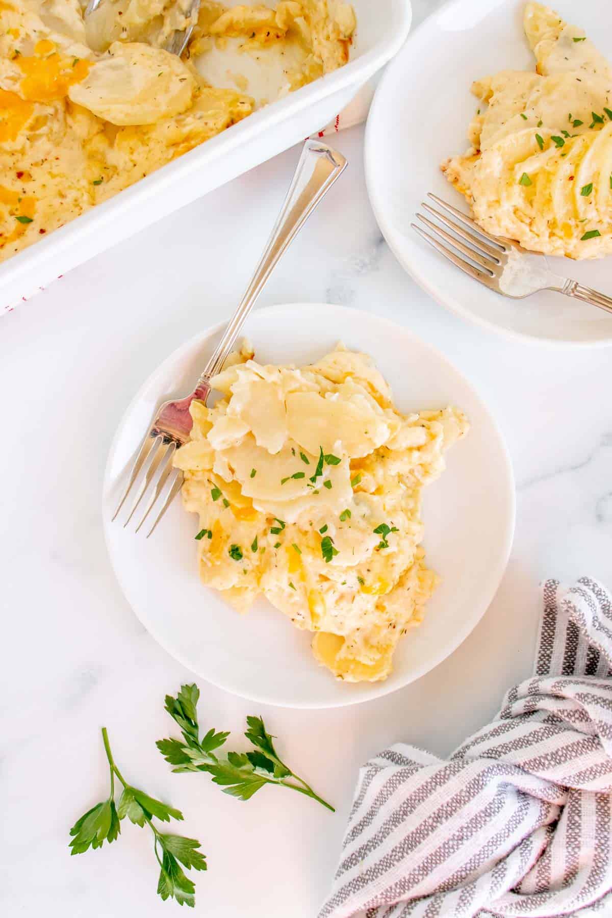 Make Ahead: Make these potatoes a day in advance! Simply pour the sauce over the potatoes as directed, then cover the pan with foil and place in the fridge until ready to bake (reserving divided cheese for the topping as directed).