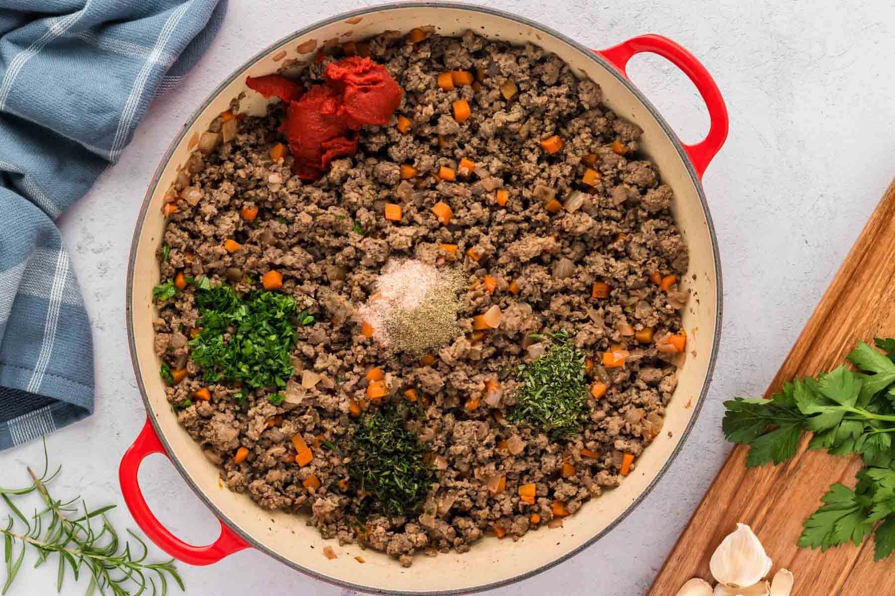 - Allow the tomato paste to cook for a couple of minutes along with the wine. Letting the tomato paste deepen in color, and the wine reduce by half. This adds depth of flavor to this cottage pie.