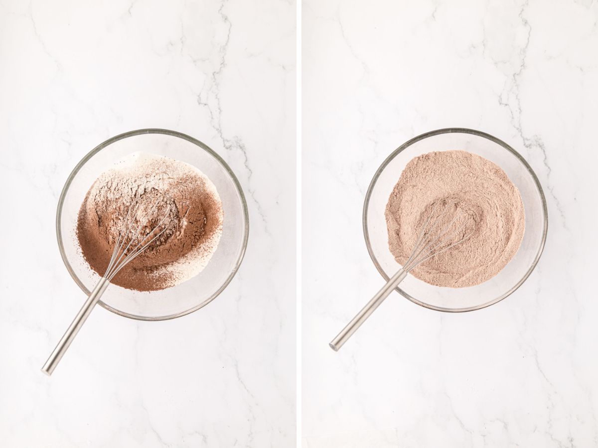 - In a large bowl, sift together the flour, sugar, cocoa powder, baking soda, and salt using a mesh sieve or strainer. Then, whisk until well combined.¾ cup all-purpose flour, ½ cup white granulated sugar, ¼ cup unsweetened cocoa powder, ½ teaspoon kosher salt, ½ teaspoon baking soda