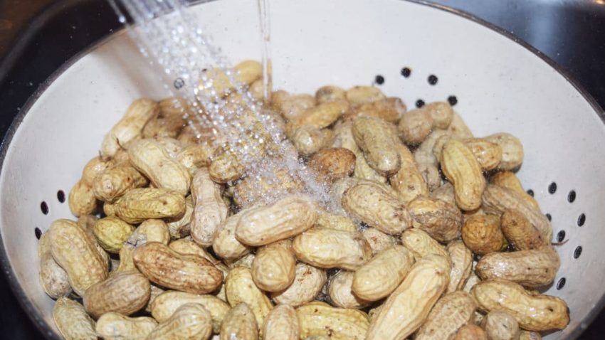 Start off with raw green peanuts. You can find them in your produce section in the grocery store. Rinse them well and then into the crock pot they go.