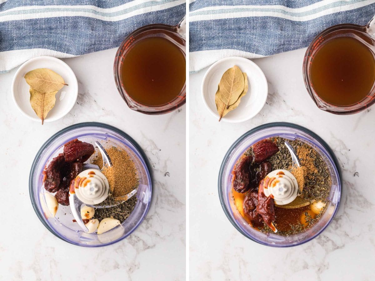 - To a blender or food processor, add the barbacoa sauce ingredients (do not add the bay leaf). Pulse until the sauce is combined and smooth.3 chipotle peppers from adobo sauce, 4 teaspoons adobo sauce, 2 limes, 4 cloves garlic, 2 teaspoons ground cumin, 2 teaspoons dried oregano, ⅓ cup apple cider vinegar, ¾ cup beef broth
