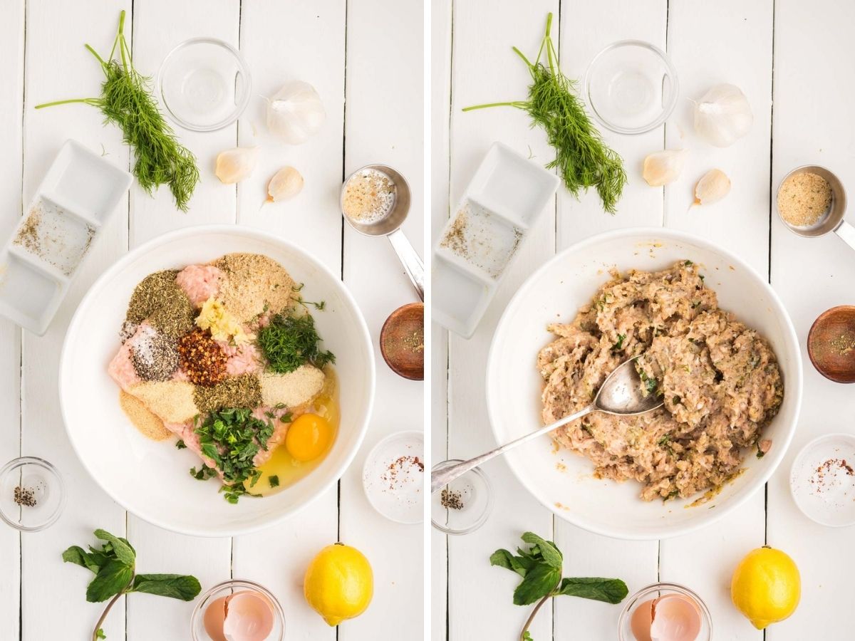 - To a bowl add the ground chicken, egg, Italian breadcrumbs, minced garlic cloves, lemon juice, fresh dill, Italian seasoning, garlic powder, onion powder, red pepper flakes, dried oregano, kosher salt, and black pepper.