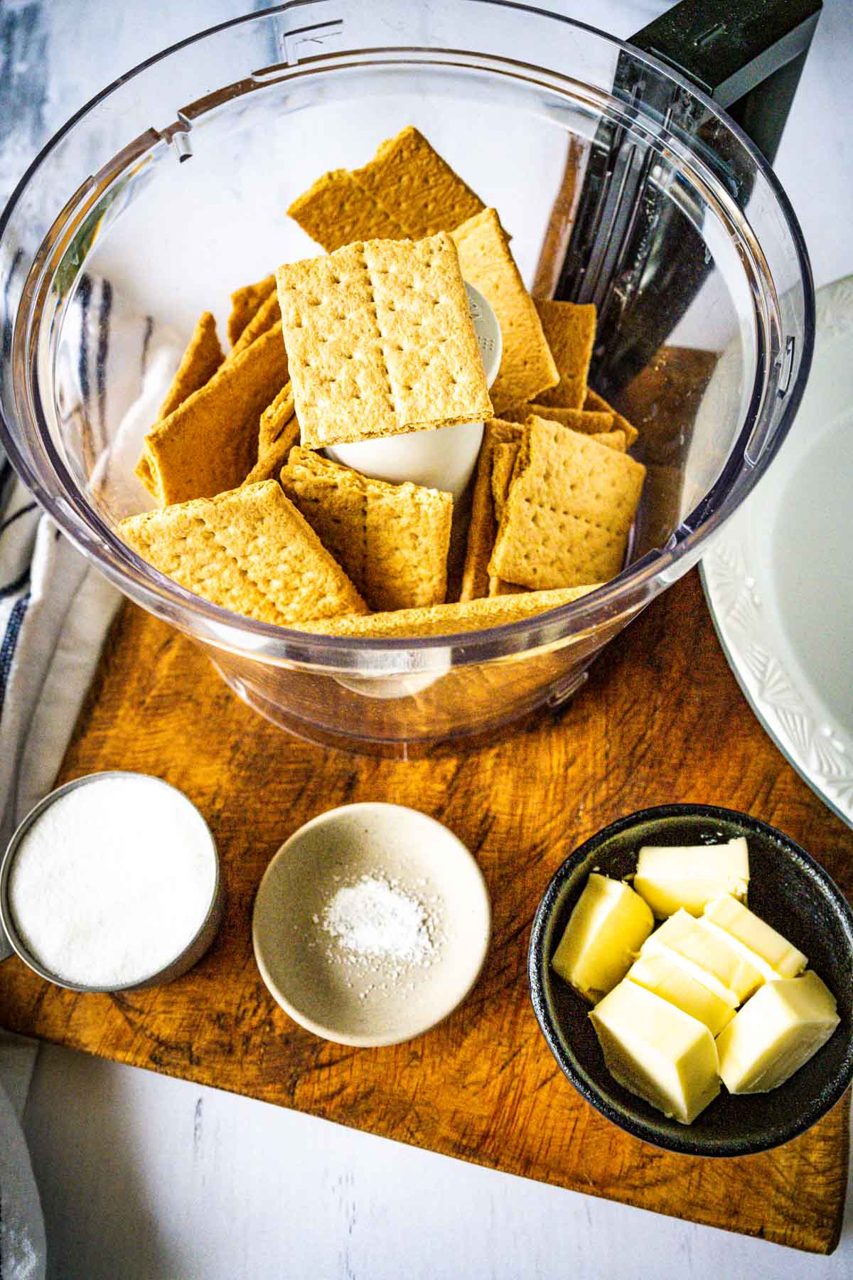 Next, pour the sugar (and pinch of salt – if not using salted butter) and melted butter into the food processor. (or add them into a bowl with the crushed graham crackers, if crushed by hand).