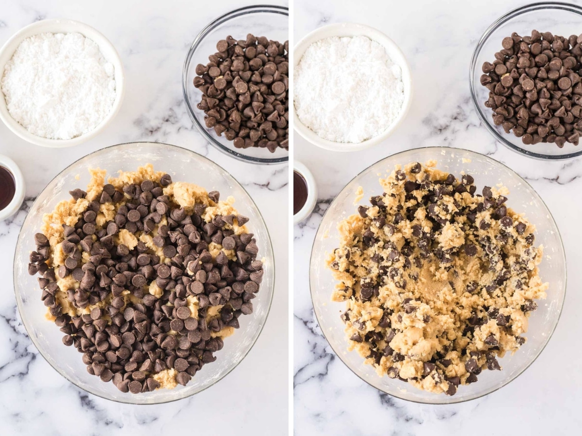 Next, gently fold the chocolate chips into the tasty cookie dough mixture until evenly distributed throughout.