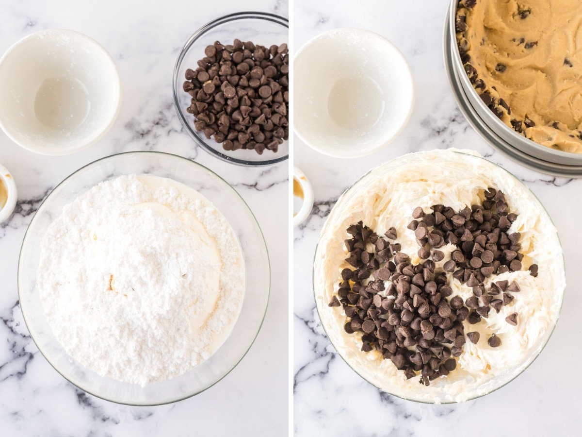 - Gently fold the chocolate chips into the cookie dough until they are evenly distributed throughout the dough. Press the cookie dough into a 10-inch springform to form a crust. Set the springform pan aside while you prepare the filling.