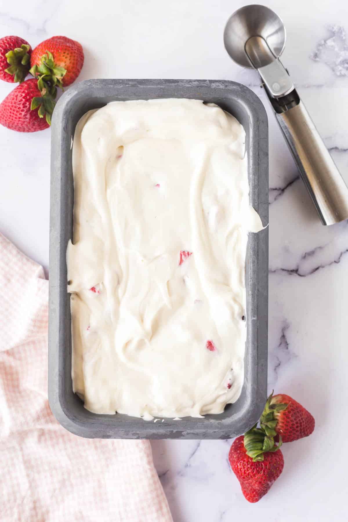 - Pour your ice cream mixture into a 9×5 inch loaf pan and allow the ice cream to set in the freezer for 6 hours, or until the middle of the ice cream is firm.