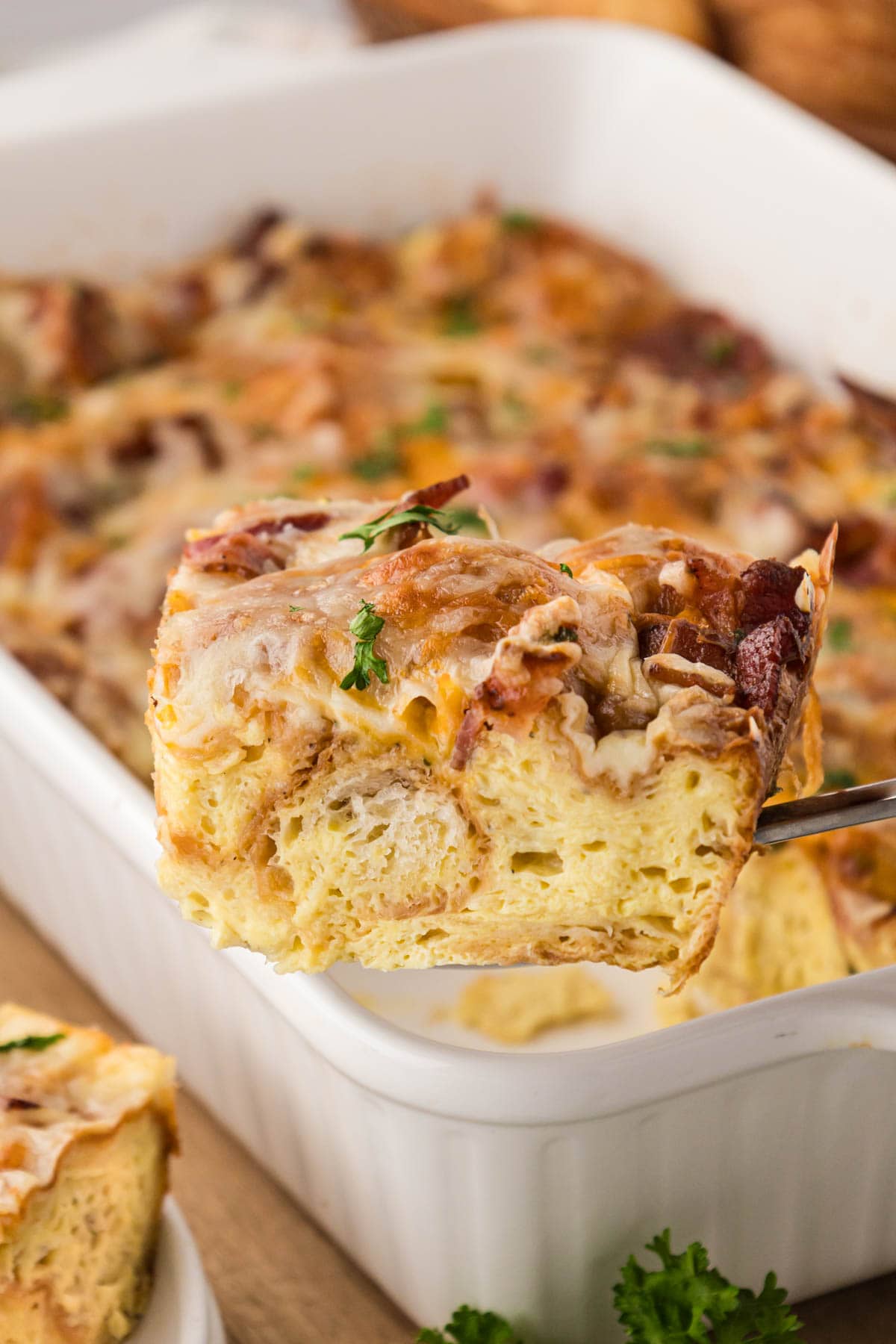 Make-Ahead Option: To save time, this dish can be assembled the night before. Prepare the egg mixture, layer the croissants, cheese, and bacon in the baking dish, and pour the egg mixture over. Cover with plastic wrap or foil and refrigerate overnight. In the morning, remove the dish from the fridge and let it sit at room temperature for 15-20 minutes before baking.