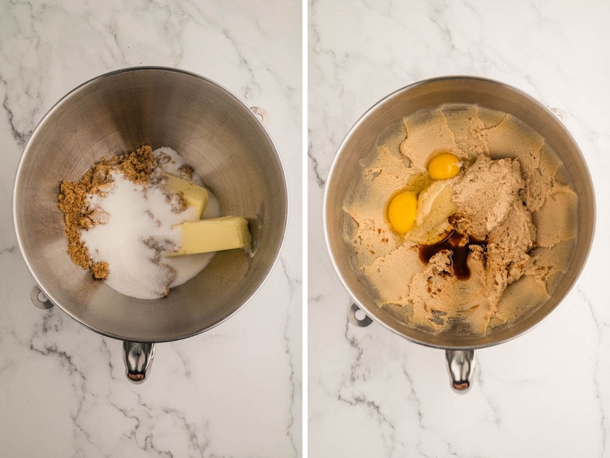 - In the bowl of a stand mixer with a paddle attachment cream the butter, brown sugar, and white sugar together till light and creamy, at least 3 minutes. Scrape the sides of the bowl at least 2 times during this time.